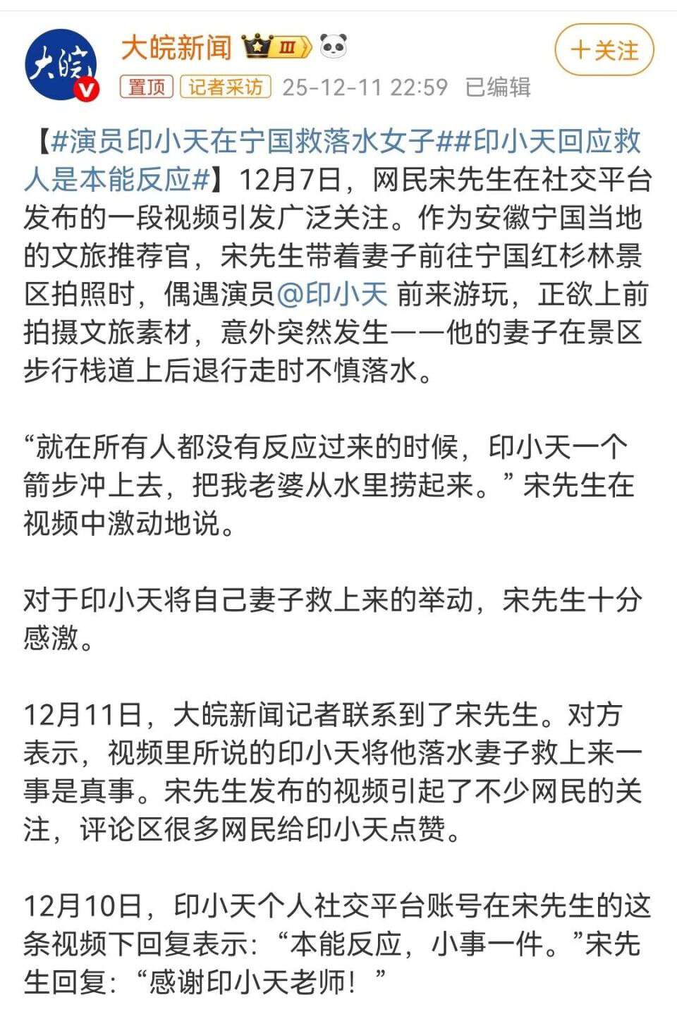 值得一提的是,印小天这次救人的红杉林景区,本身就是“皖南川藏线”上的网红景点。他当时正在安徽拍摄电视剧《种墨园》,游玩属于个人行程,之前还配合当地文旅拍过打卡视频,帮着宣传当地旅游。这次事件之后,不少网友说“被印小天圈粉,也想去红杉林看看”,无意间还帮当地带动了文旅热度,也算是意外之喜。